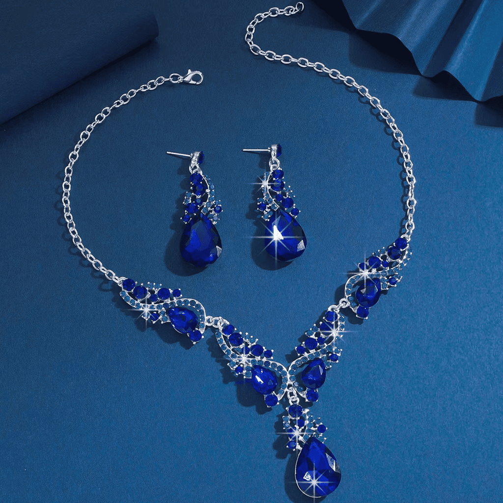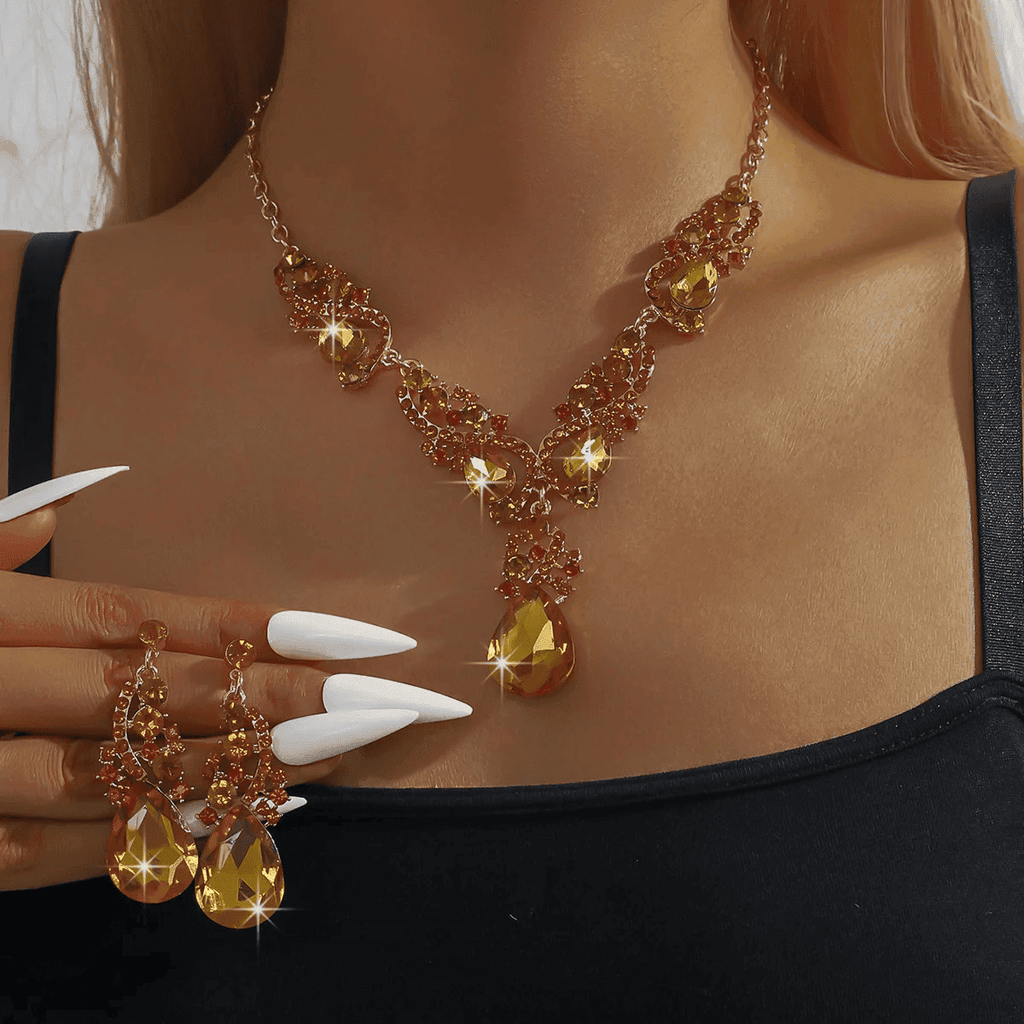 Composto por um colar e brincos em formato de gota d'água, este conjunto foi feito para mulheres que desejam destacar sua beleza com um toque romântico e encantador.